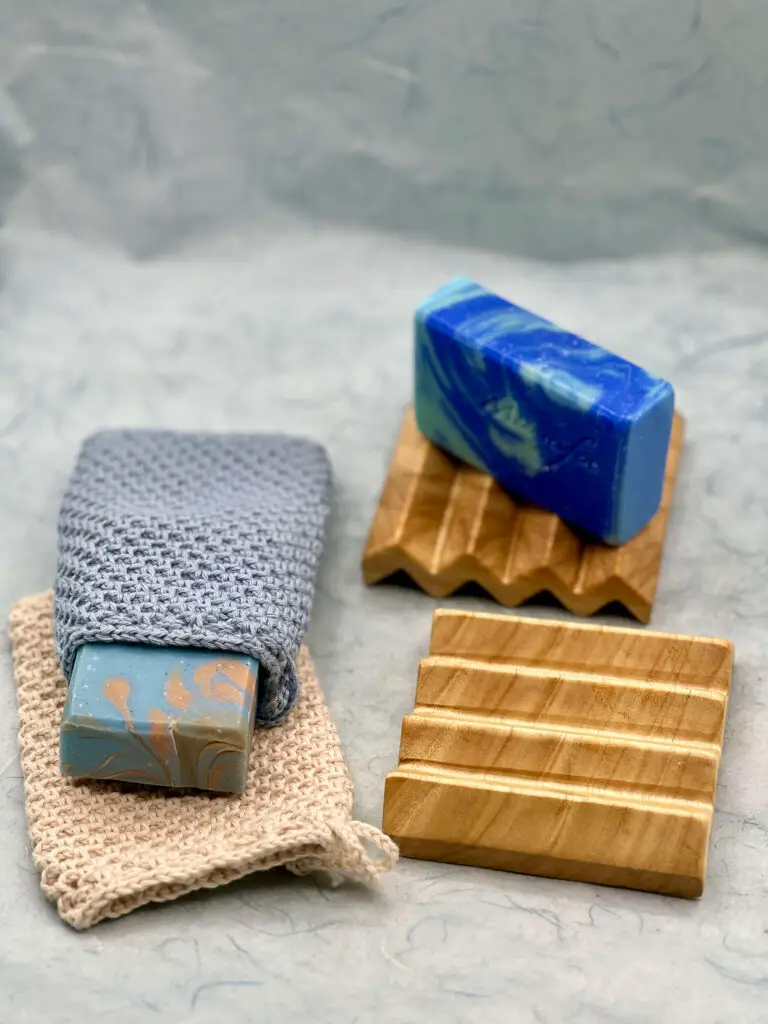 Seifenschalen aus Holz, handgehäkelte Seifensäckchen